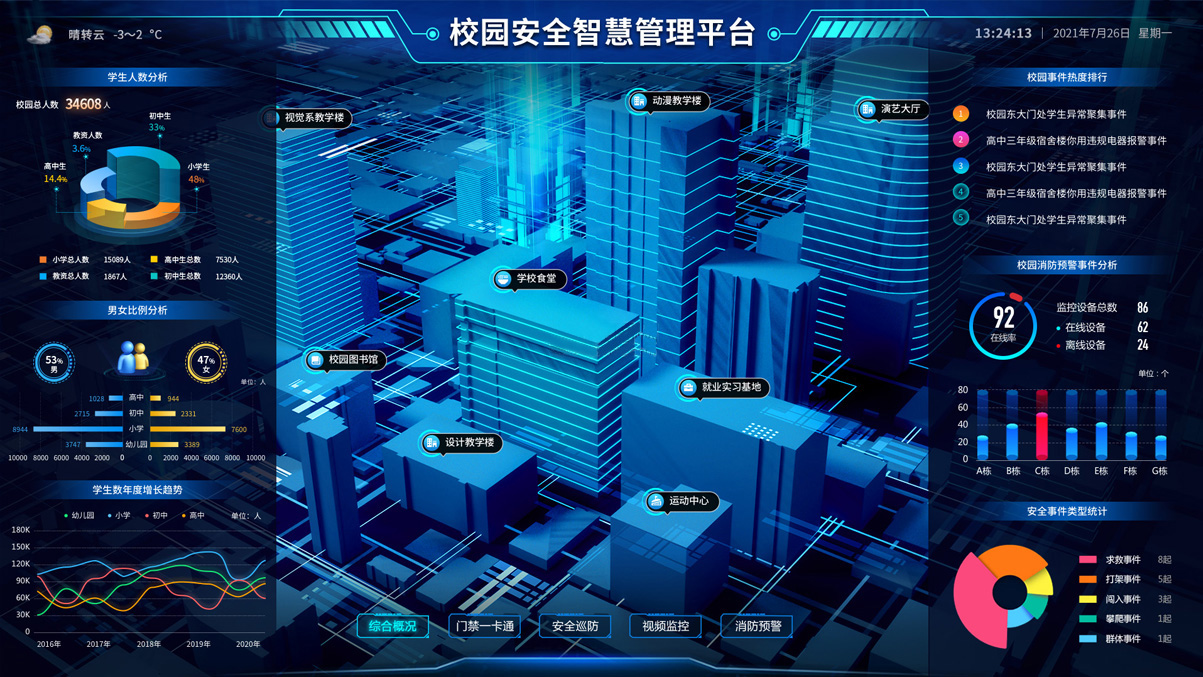 全方位立體式還原院區(qū)實(shí)貌,分圖層對院區(qū)的區(qū)域、建筑、單位、安防設(shè)備、管理設(shè)備、警情等進(jìn)行查看、監(jiān)控和跟蹤;通過院區(qū)各類安防管理設(shè)備實(shí)時獲取各重點(diǎn)監(jiān)控區(qū)域的監(jiān)控?cái)?shù)據(jù),對各種突發(fā)事件進(jìn)行報(bào)警。通過人臉識別、車牌識別、行為識別、武器管理、營區(qū)設(shè)備等各類傳感器,對人、車、物及其行為的全面感知,保障營區(qū)安全。 -
