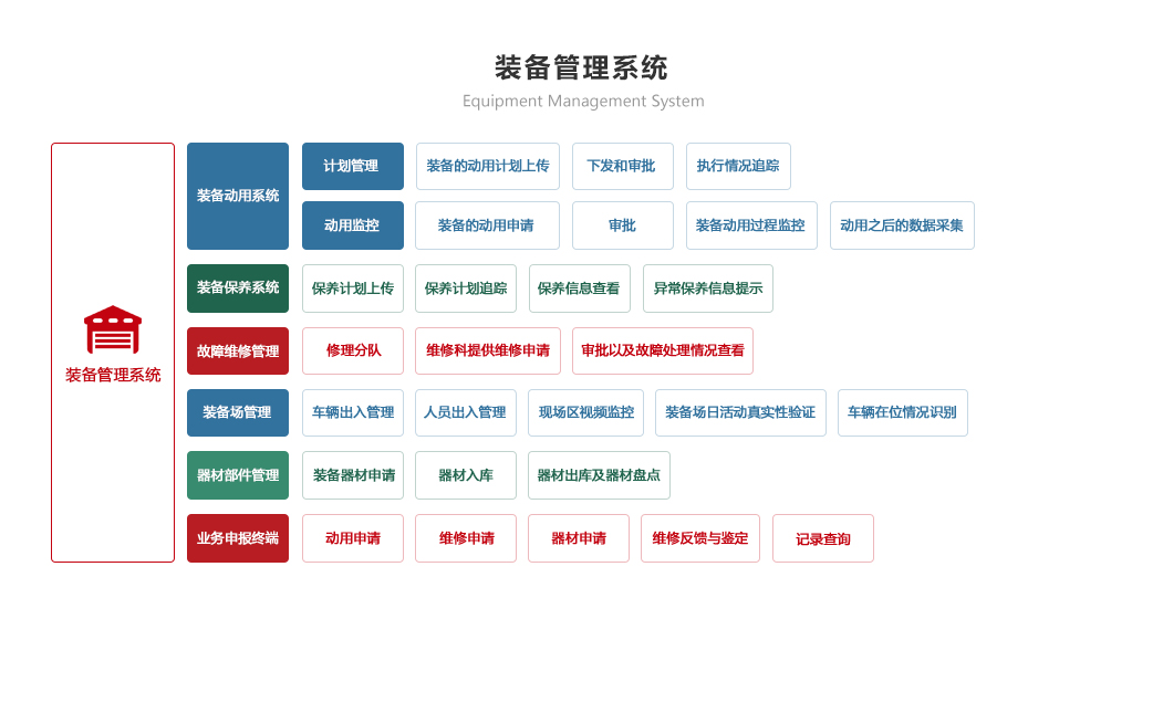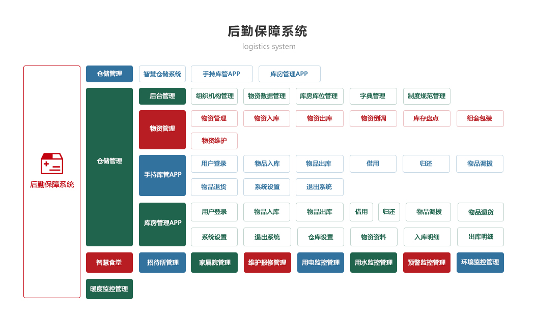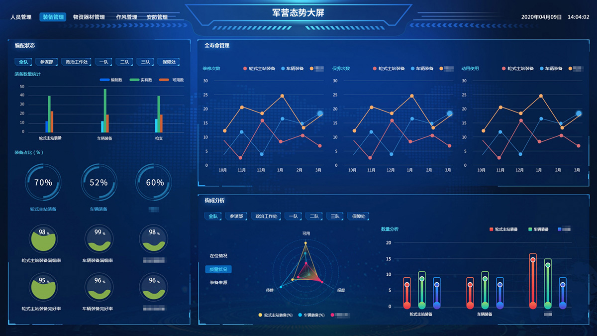 綜合保障系統(tǒng)依托物聯(lián)網(wǎng)、RFID識別和傳感技術(shù),著眼作戰(zhàn)精準(zhǔn)保障、戰(zhàn)備常態(tài)保障和官兵生活保障,對戰(zhàn)備物資、裝備器材、營房物資和被裝物資等的全生命周期的電子化管理,對官兵的健康實(shí)時監(jiān)護(hù)。包含財(cái)務(wù)管理、軍需油運(yùn)、武器裝備、衛(wèi)勤管理、營房管理模塊。確保部隊(duì)出動,車輛給養(yǎng)油料跟得上,裝備維護(hù)情況實(shí)時掌握,營房管理工作平時與戰(zhàn)備同步推進(jìn)。