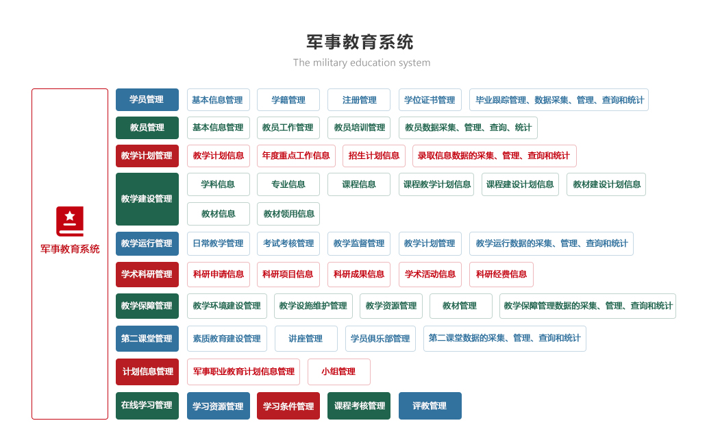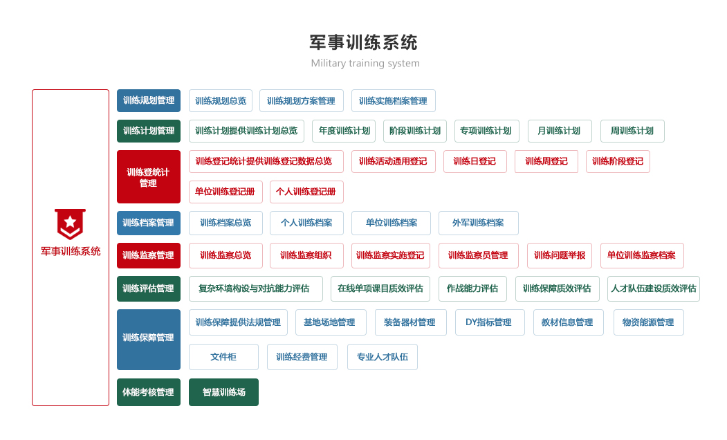 包括訓(xùn)練計(jì)劃、訓(xùn)練檢查、訓(xùn)練考核、訓(xùn)練檔案、訓(xùn)練資源模塊,實(shí)現(xiàn)對訓(xùn)練計(jì)劃制定情況自動統(tǒng)計(jì)和智能分析、逐步解決訓(xùn)練時間、訓(xùn)練人員落實(shí)情況、實(shí)現(xiàn)智能報(bào)靶和體能訓(xùn)練監(jiān)測、實(shí)現(xiàn)網(wǎng)上模擬訓(xùn)練與考核的智能化、自動化和便捷化,對訓(xùn)練資源科學(xué)管理,確保為軍事訓(xùn)練工作有力支撐。